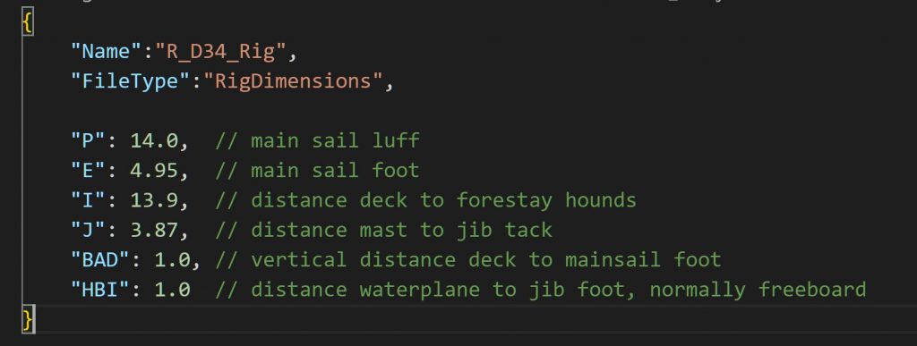 Main dimensions of hull, rig and sails are provided using human-readable commented JSON files. Here is an example of a commented JSON file, defining the yacht’s rig dimensions (The Visual Studio Code editor is an excellent choice to edit the JSON text files).