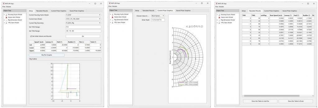 VPP4 features a user interface, allowing to load a larger set of JSON files for the hull, the rig and sail set configurations. These can then be set for a particular combination of hull, rig and sail coefficients.